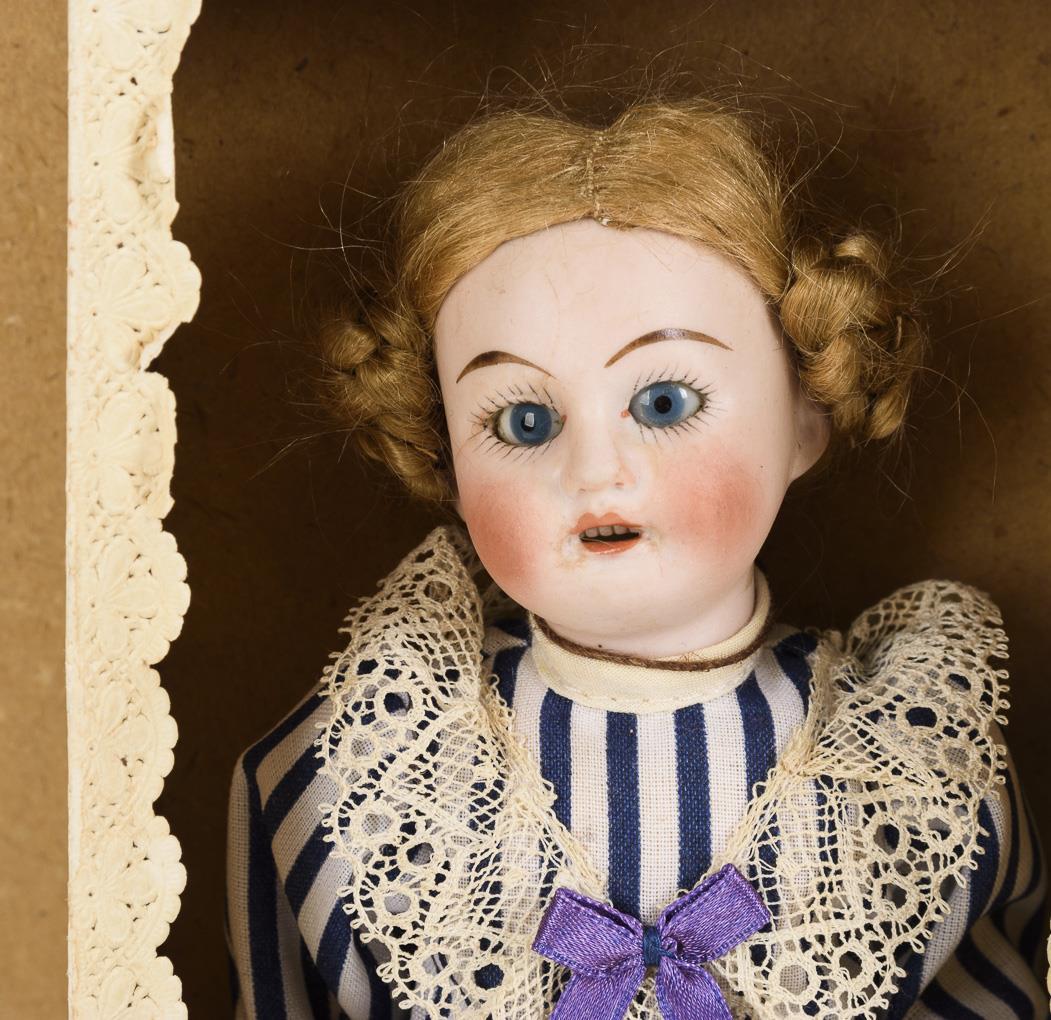 Crank head, fixed blue eyes, blonde mohair wig. Standing doll body with sculpted shoes and painted stockings. Blue and white striped dress. Fixed in original box.
