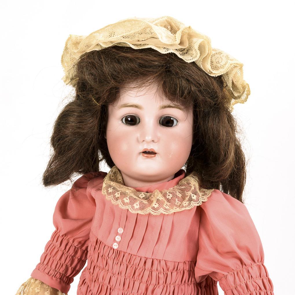 Crank head, brown sleeping eyes, pierced ears, taped brown wig. 15-piece limb body. Pink dress, white lace hat, black shoes. Head not x-rayed, but no defects visible.