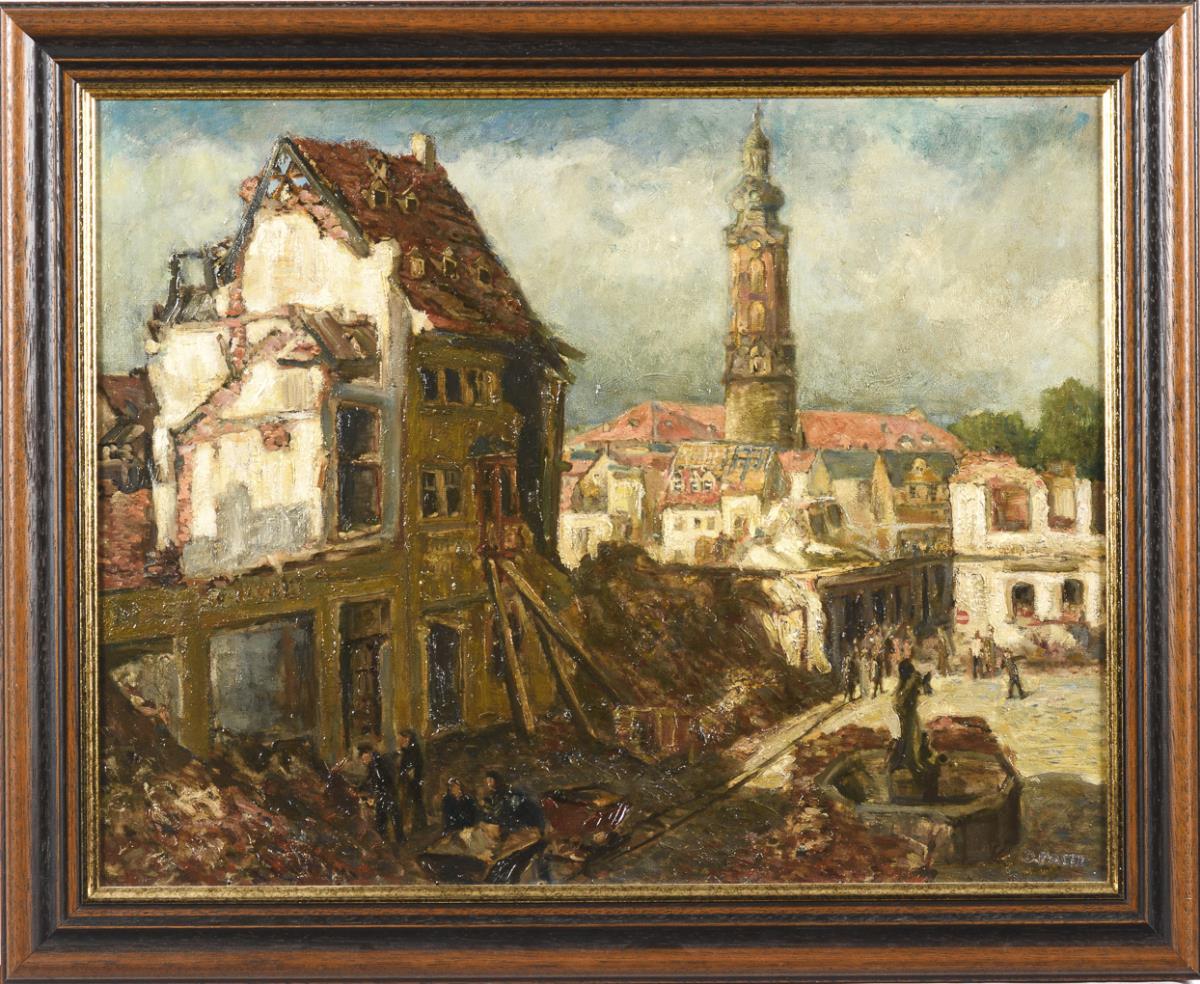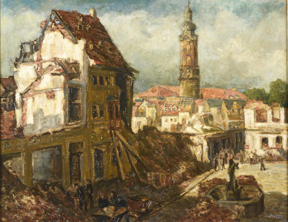 View of Weimar destroyed by the war. According to his own account, Paetz painted the painting from the balustrade of the town hall, next to his colleague Engelbert Schoner.