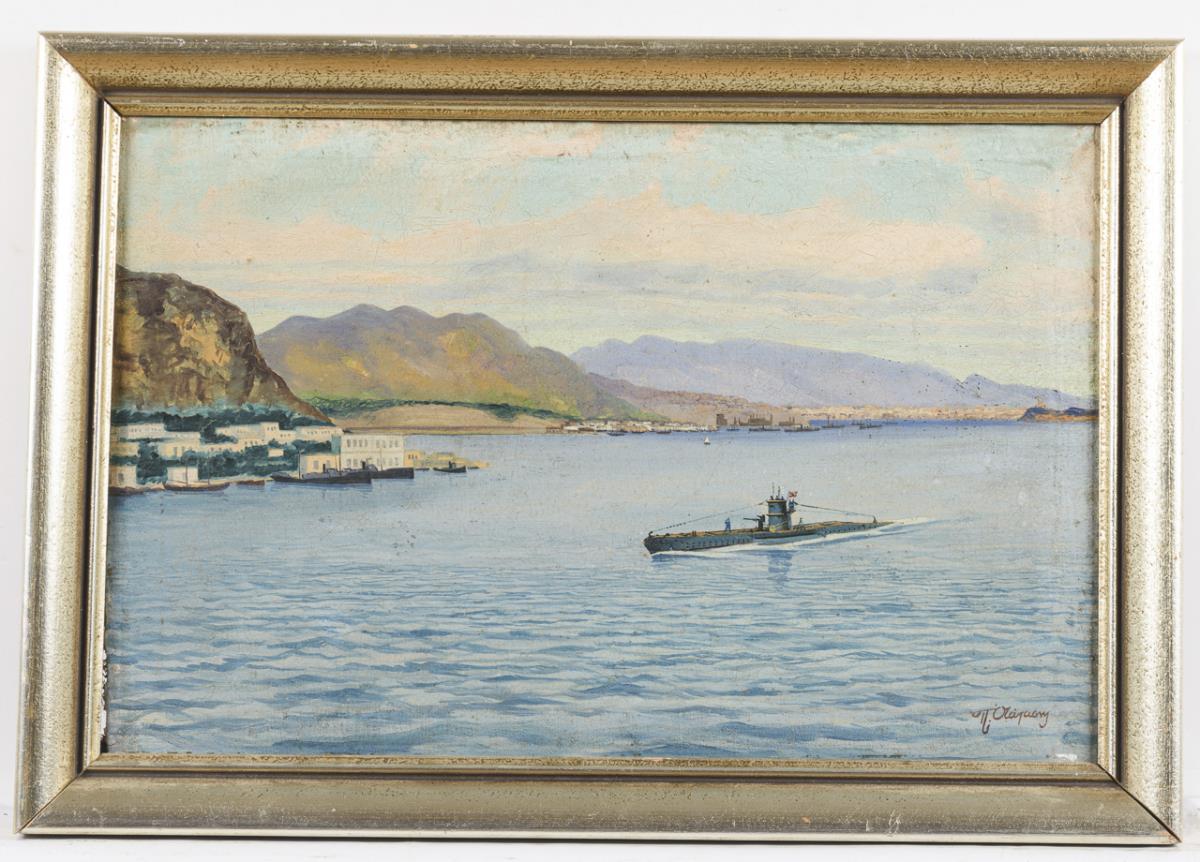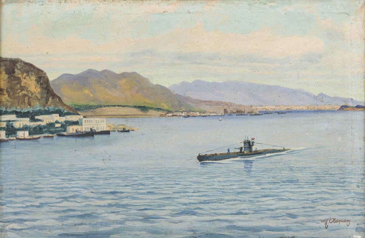 Submarine on the calm water near a mountainous coast. Two restored spots with back-adhesions.