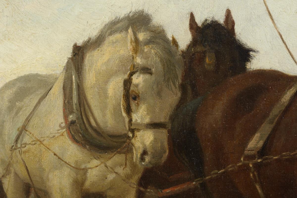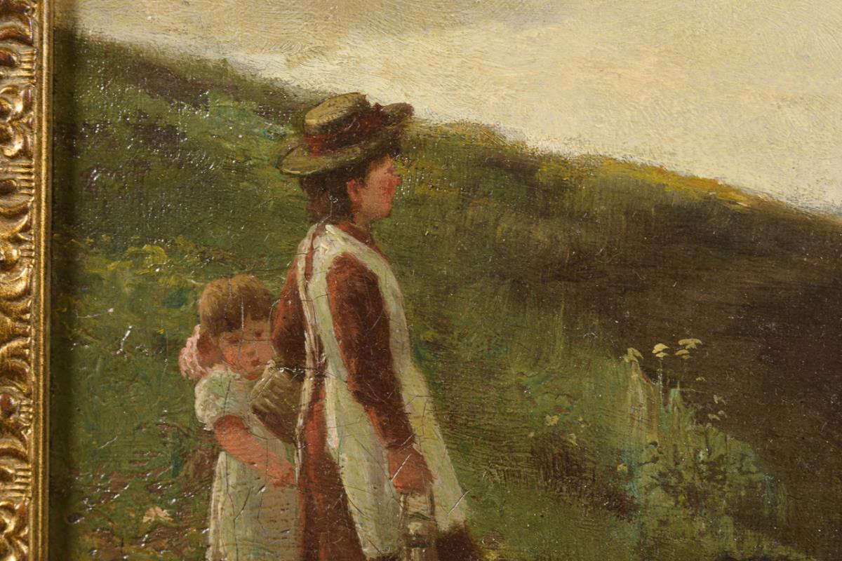 The farmer with the horses in the field plowing while the children and the dog watch from the edge of the field. Canvas doubled.