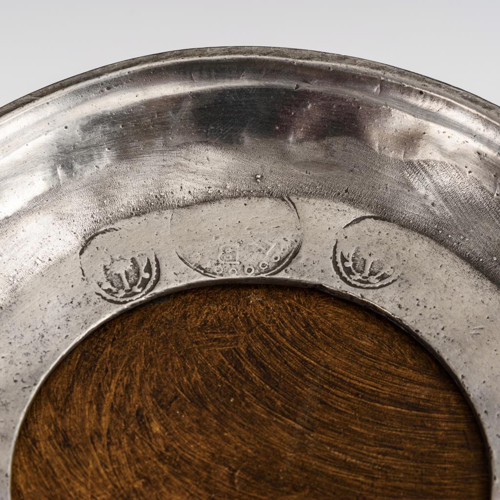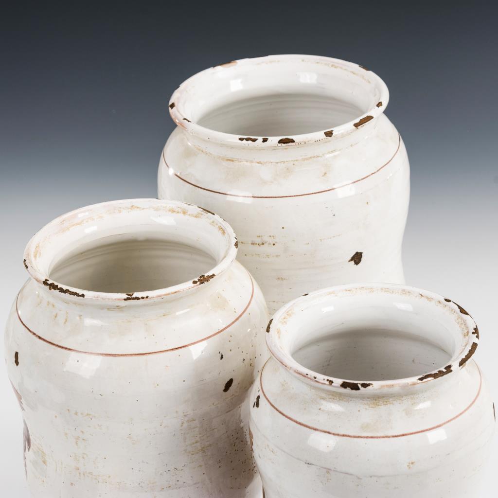 Zylindrische Albarelli mit leicht eingeschnürtem Bauch, schauseitig gemalte Rollwerkkartuschen mit Vögeln und Bezeichnung. Gewölbte Zinndeckel mit Kugelknauf, innen undeutlich gepunzt, Zinnstandring. Glasurdefekte, Gebrauchsspuren am Zinn.