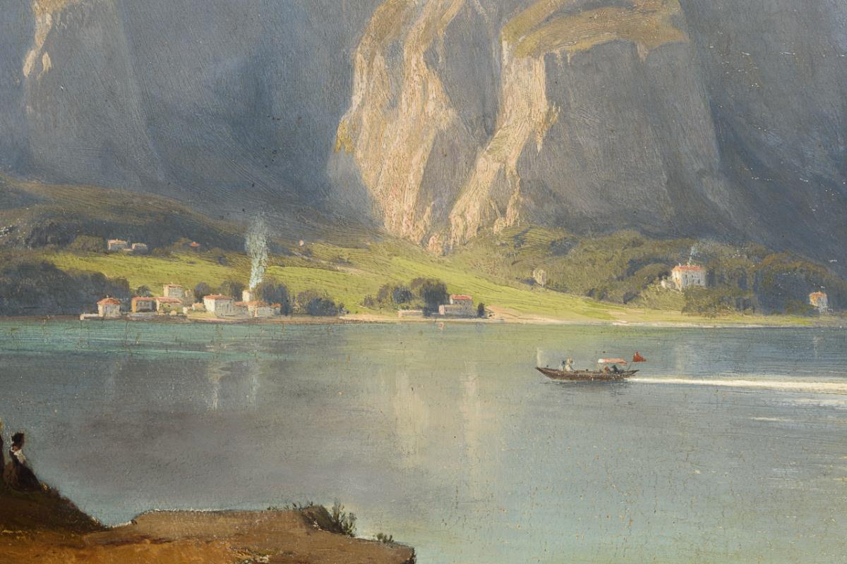Staffage figures on steep bank of the lake with view to the village on the other side in the sunshine below the mountains. Minimal traces of age.