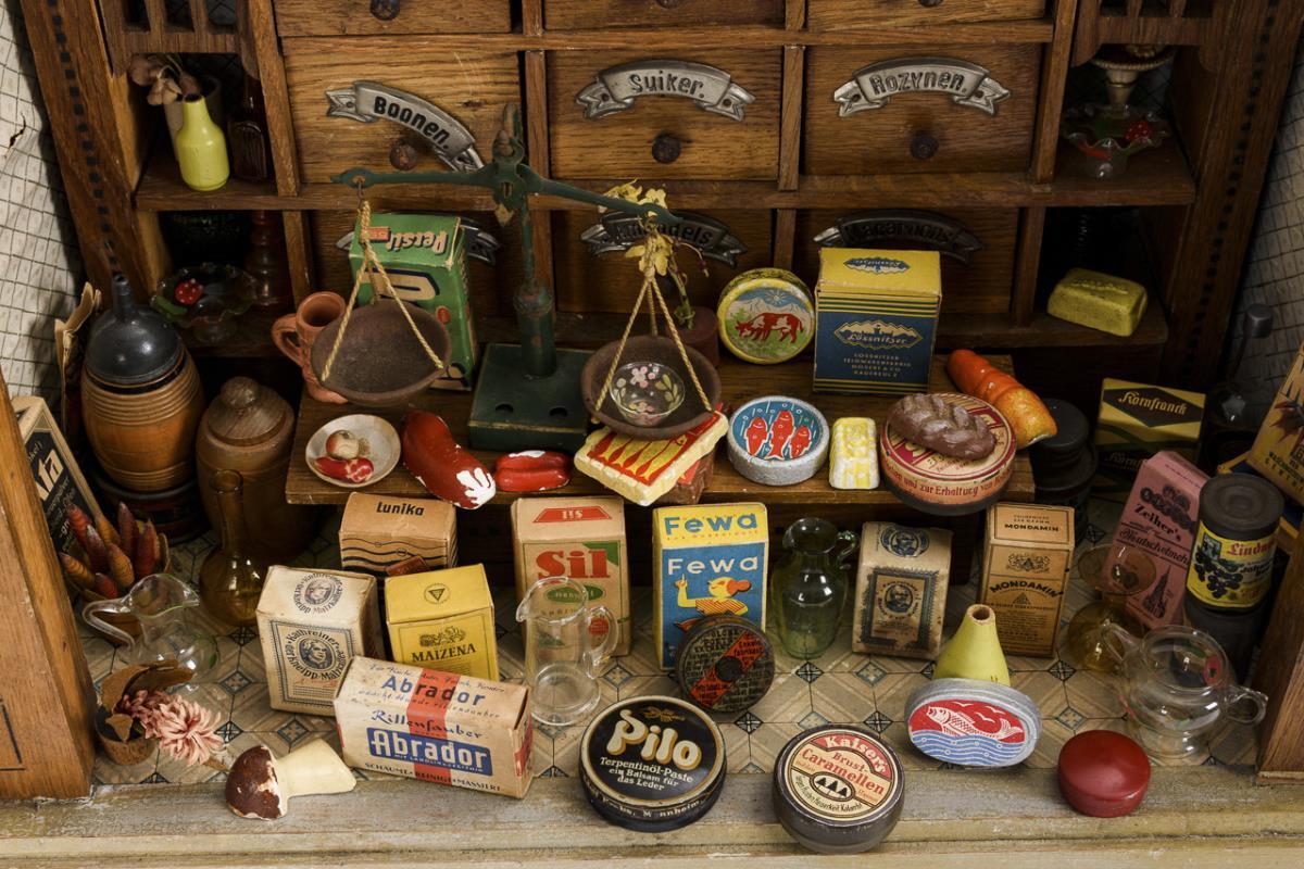 Trapezoidal case, old wallpapered, tile-look floor paper. At the front 2 display windows, shop fitting with 9 Dutch labelled drawers. With scales and numerous accessories. Small defects, must be partly re-glued.