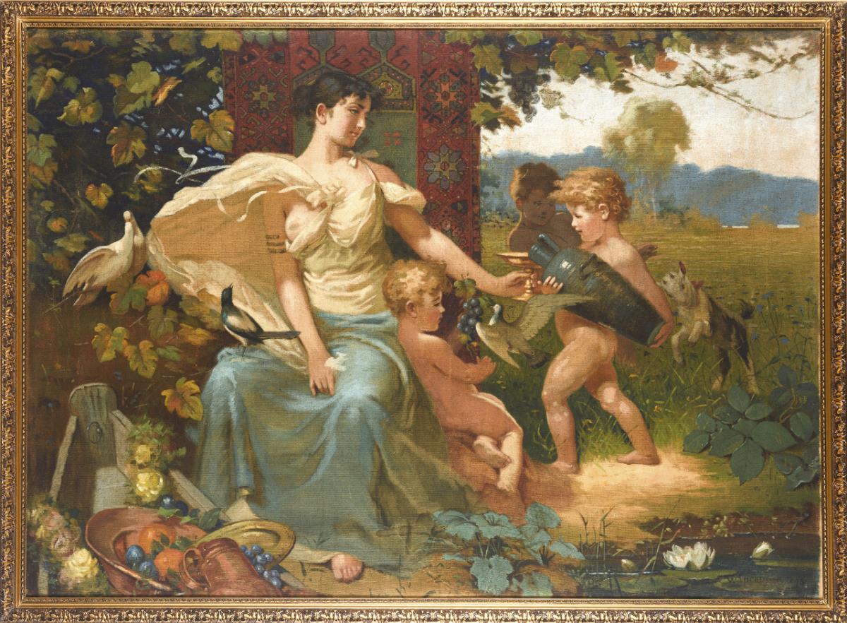 Young woman in antique dress under vines and by a boat filled with fruit as well as three boys, doves and a goat.