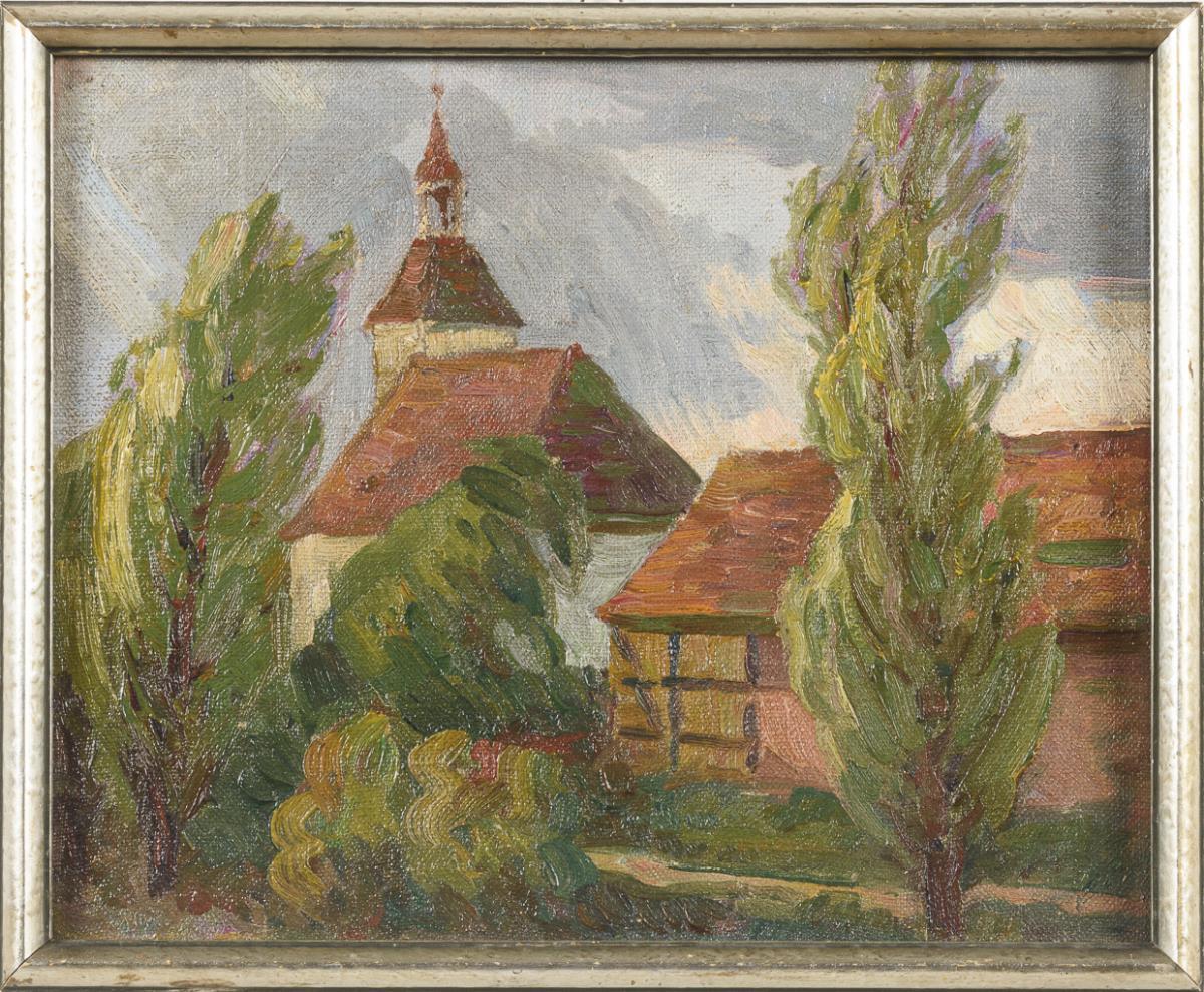 Oil/canvas/cardboard. Unsigned, inscribed/titled on verso.