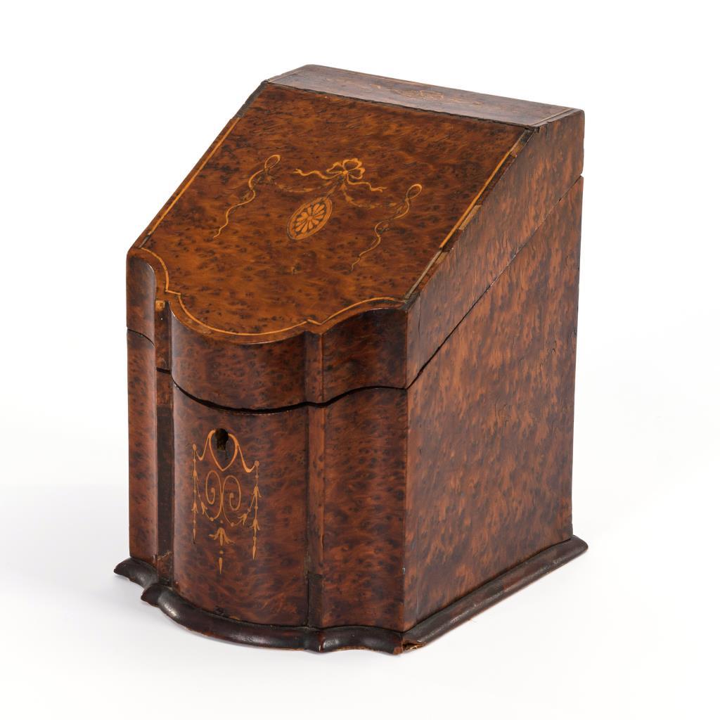 Schrägpult-Dokumentenschatulle mit geschweifter Front sowie ornamentalen Einlagen ebd. und auf dem Scharnierdeckel. Innen Fachung. Schloss ausgebrochen und evtl. ergänzt, 1 Haarriss, einige Fehlstellen.