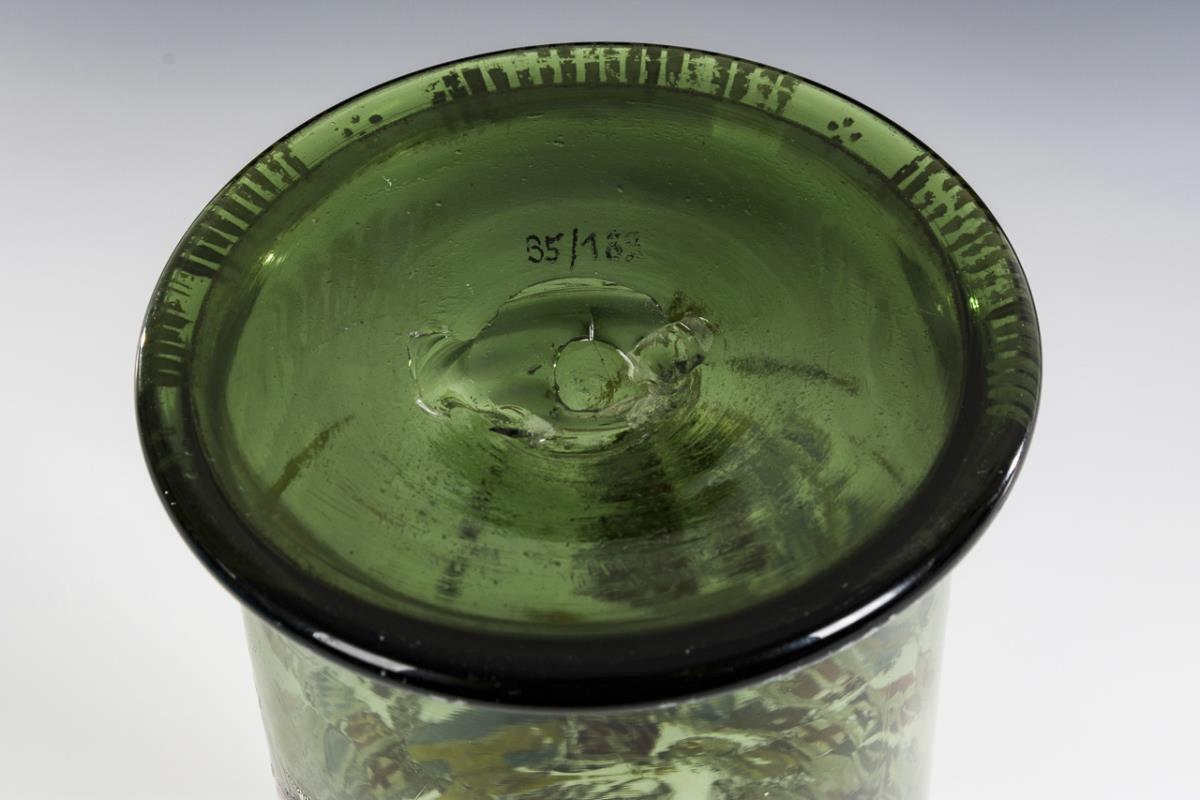High cylindrical glass, demolition. On the front the depiction of the imperial eagle with escutcheons. Bernished, lid missing.