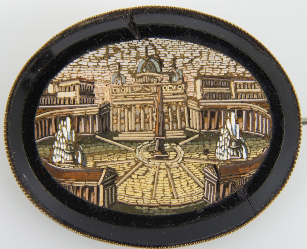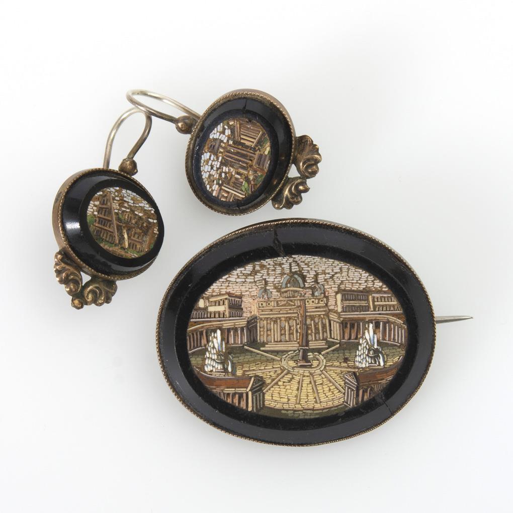 Brooch with St. Peter's motif in frame setting. Hook clasp. Earrings with antique achitecture on large hook. Black glass setting of brooch with hairline crack. Some glass rods in the mosaic of the brooch and earrings missing.