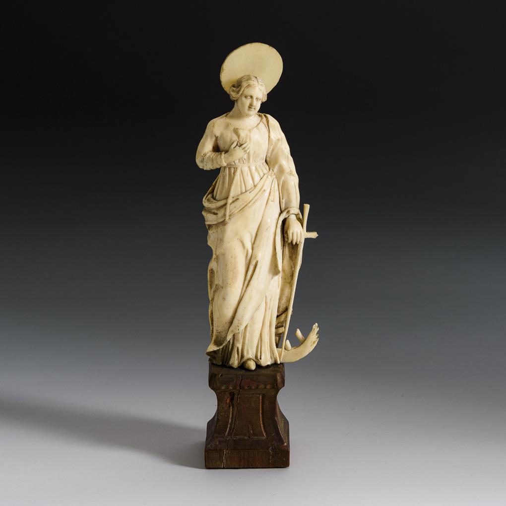 The standing saint with broken wheel and sword and nimbus. 1 finger and 1 foot missing, ivory and base somewhat hair cracked.