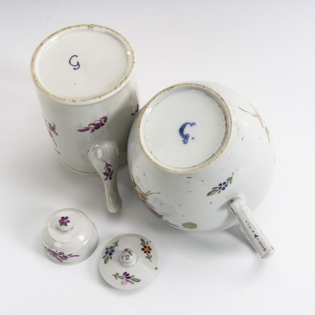 Cylindrical teapot with angled handle and bulbous teapot with rocaille handle. Teapot with scratch marks and small bump on the scroll.