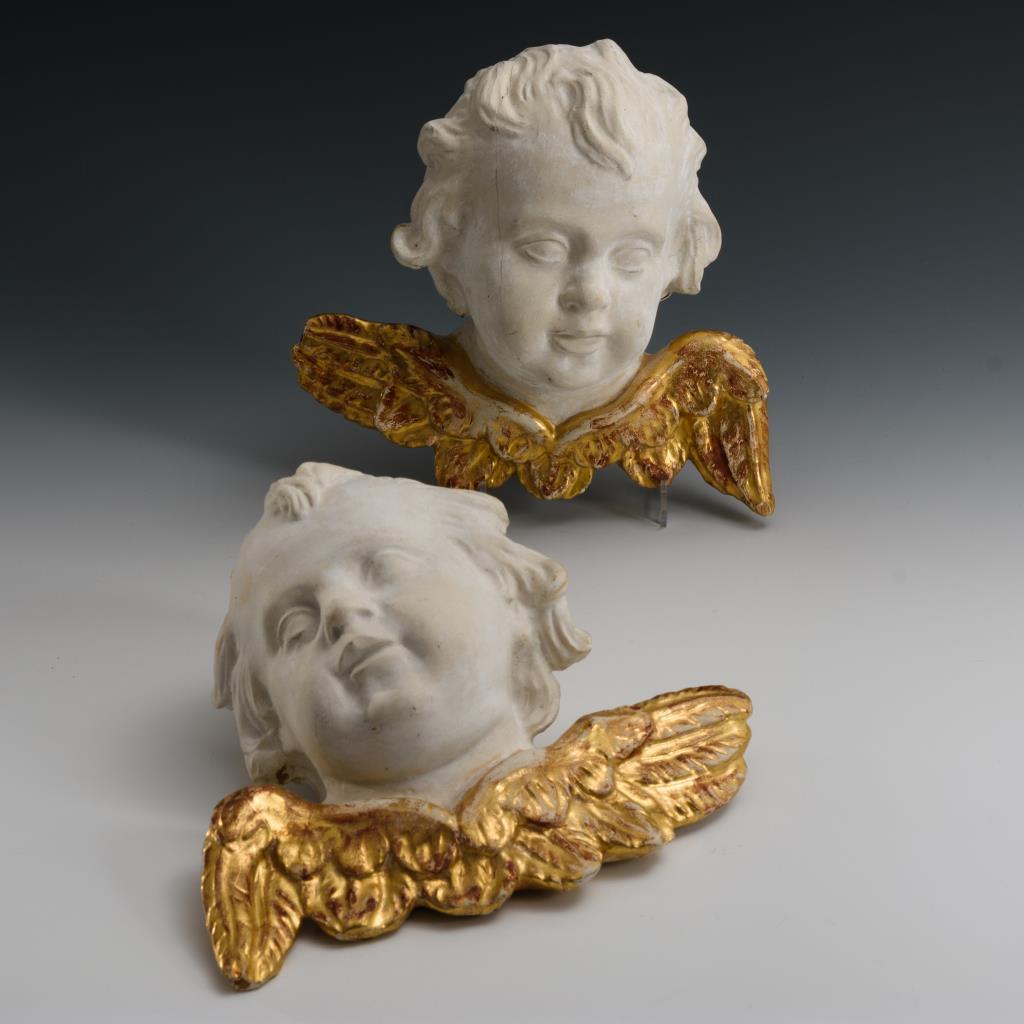 Wohl nachträglich grundierte bzw. vergoldete Engelsköpfe. Gering haarrissig, Vergoldung berieben, minimale Fehlstellen.