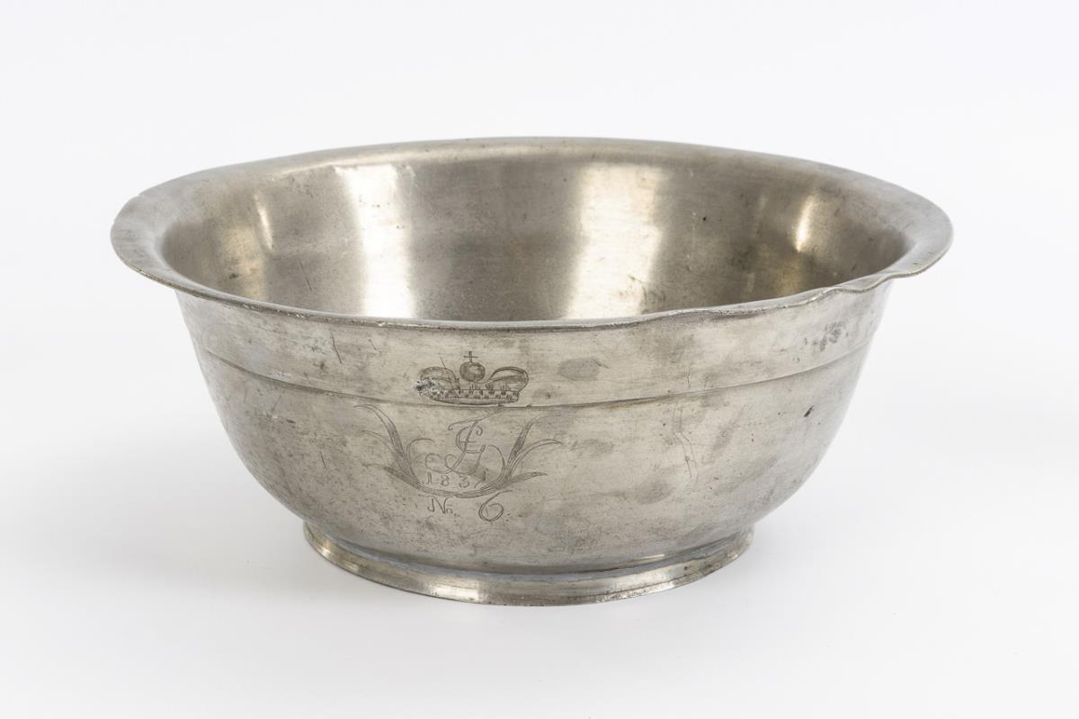 Deep bowl engraved on the outside: Ligated monogram FG with date 1837 and "No. 6" under princely crown (Friedrich Günther von Schwarzburg-Rudolstadt?). / Hexagonal screw-can with monogram engraving and date 1820; on the bottom inventory label from the Thuringian State Museum Heidecksburg. / On round plate under the flag monogram engraving with date 1765. / Oil sparkle as oil clock. Dish and sparkle with solder repairs, each age / use traces.