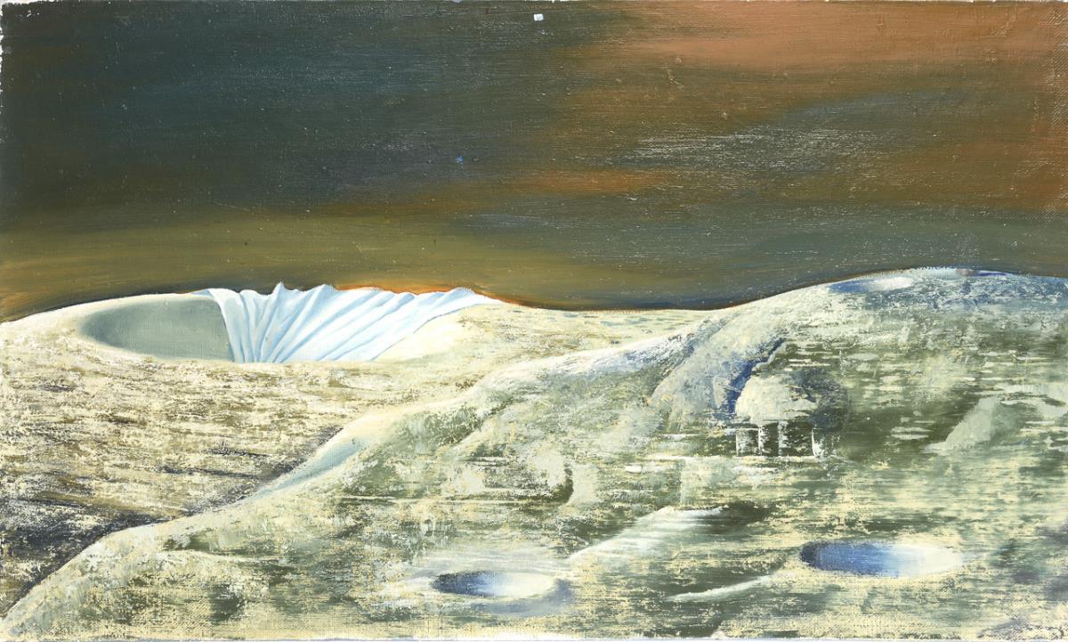 Surrealistic crater landscape with white sheet under diffuse sky.
