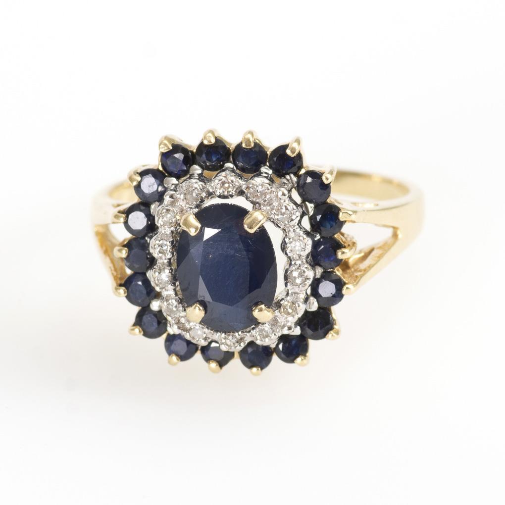 Claw-set sapphire surrounded by small diamonds and sapphires. Narrow rail.