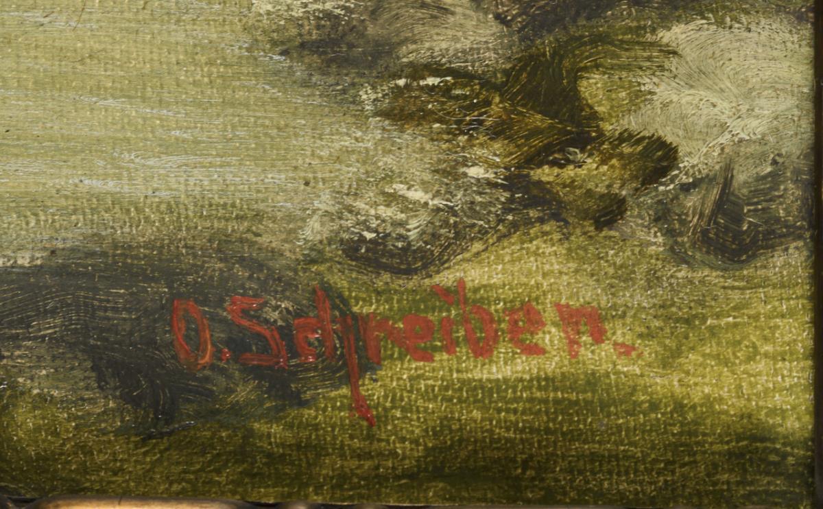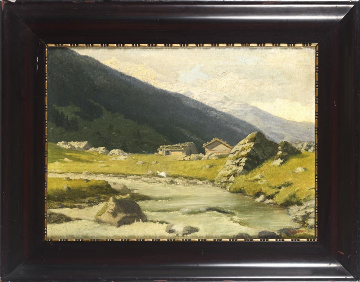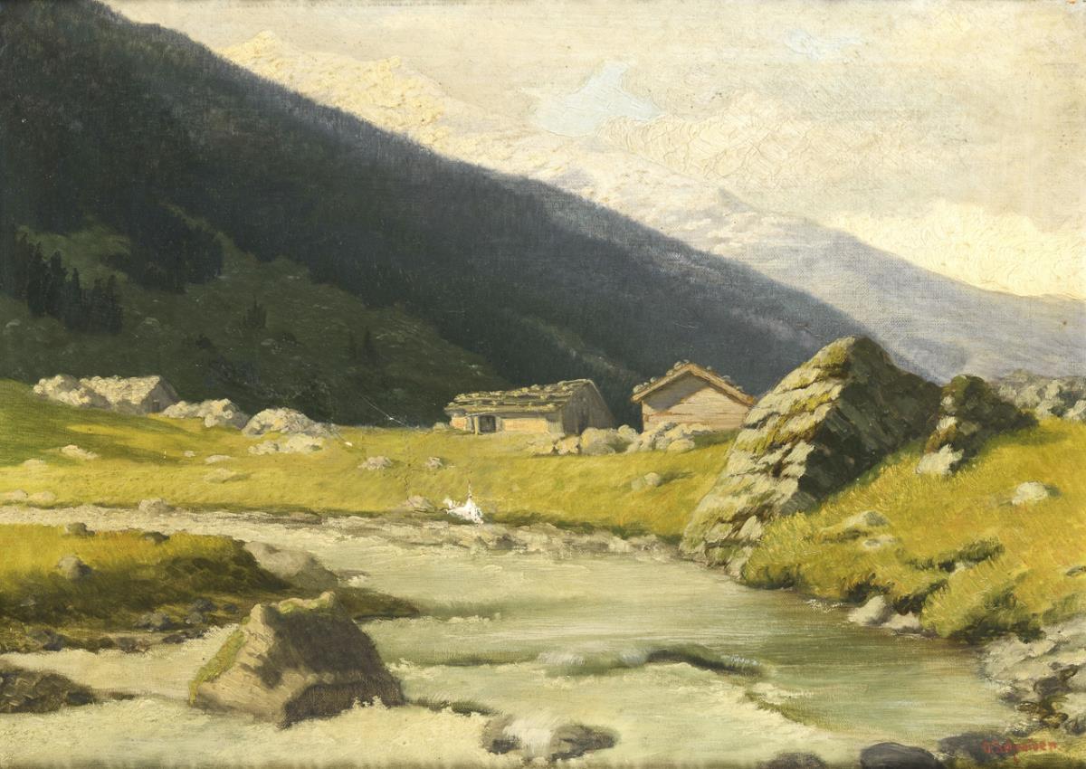 Alpine huts in the sunshine near a river course with view to the wooded mountain slopes. Canvas doubled, one defect.