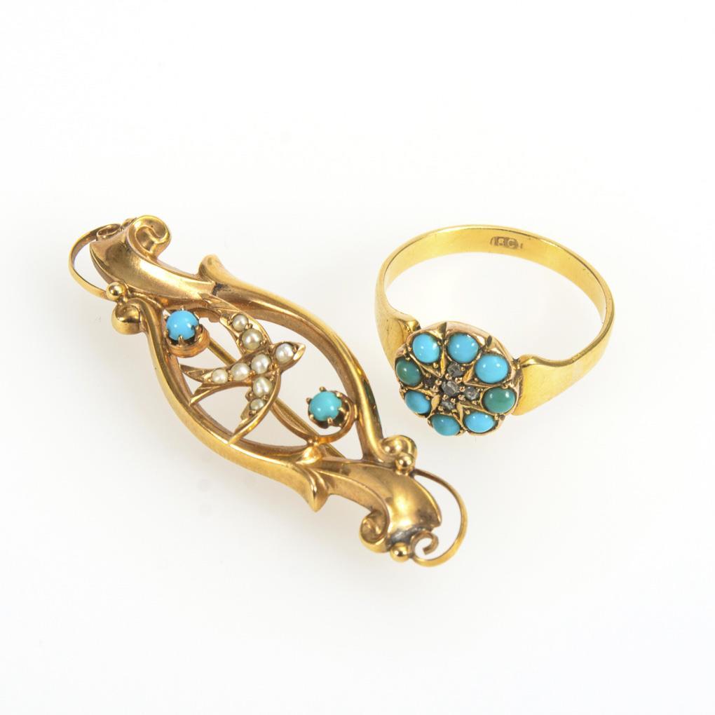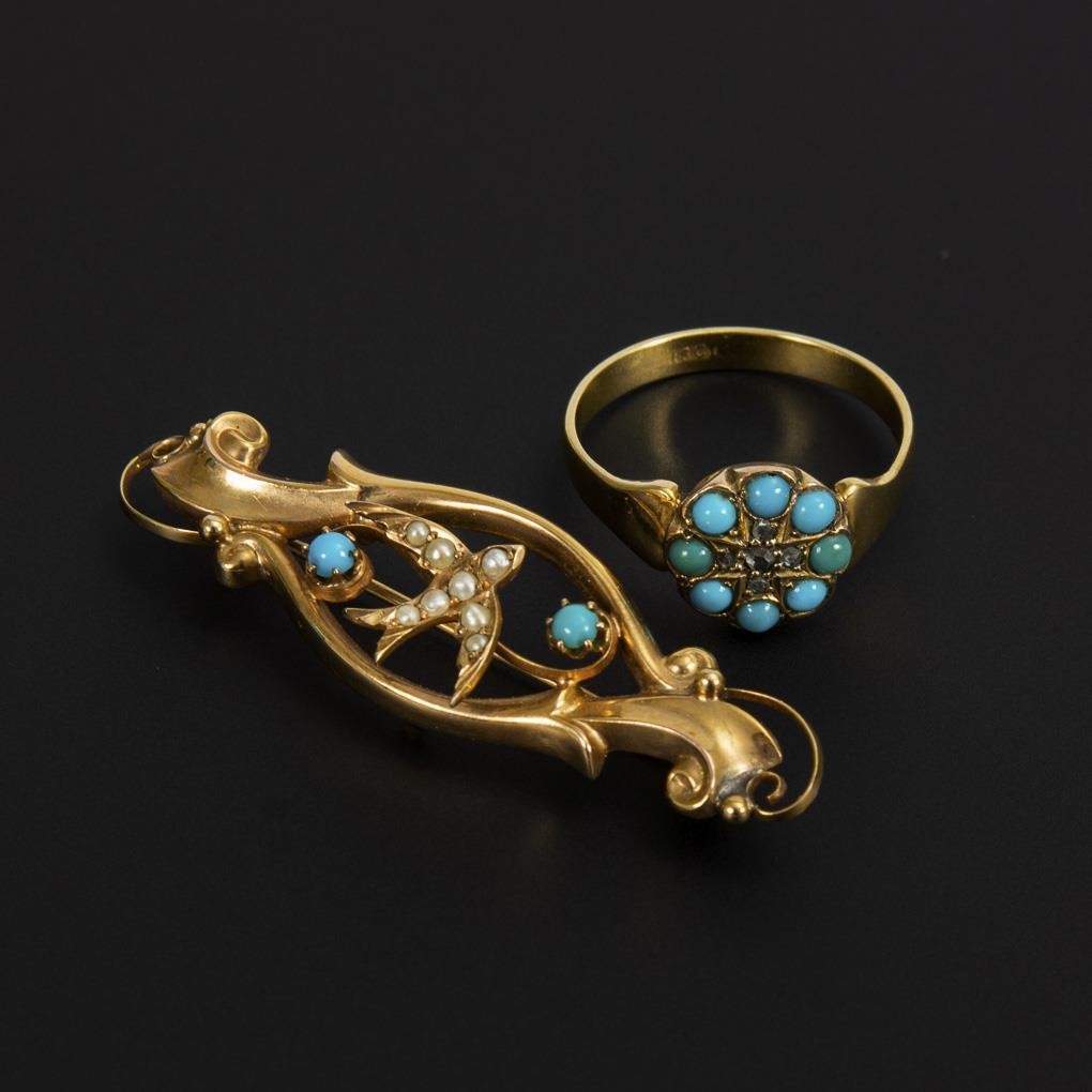 Relief brooch with turquoise cabochons and pearls. Ring head with turquoise baubles and small