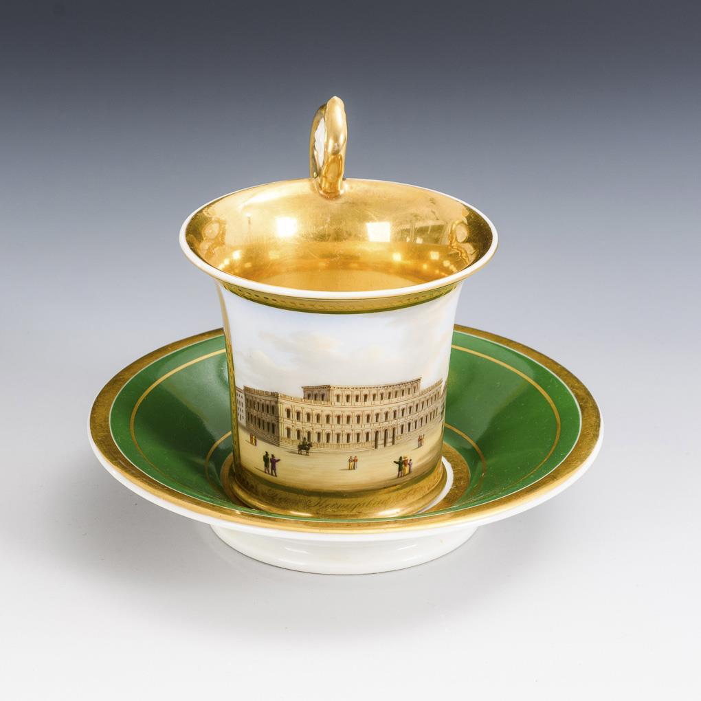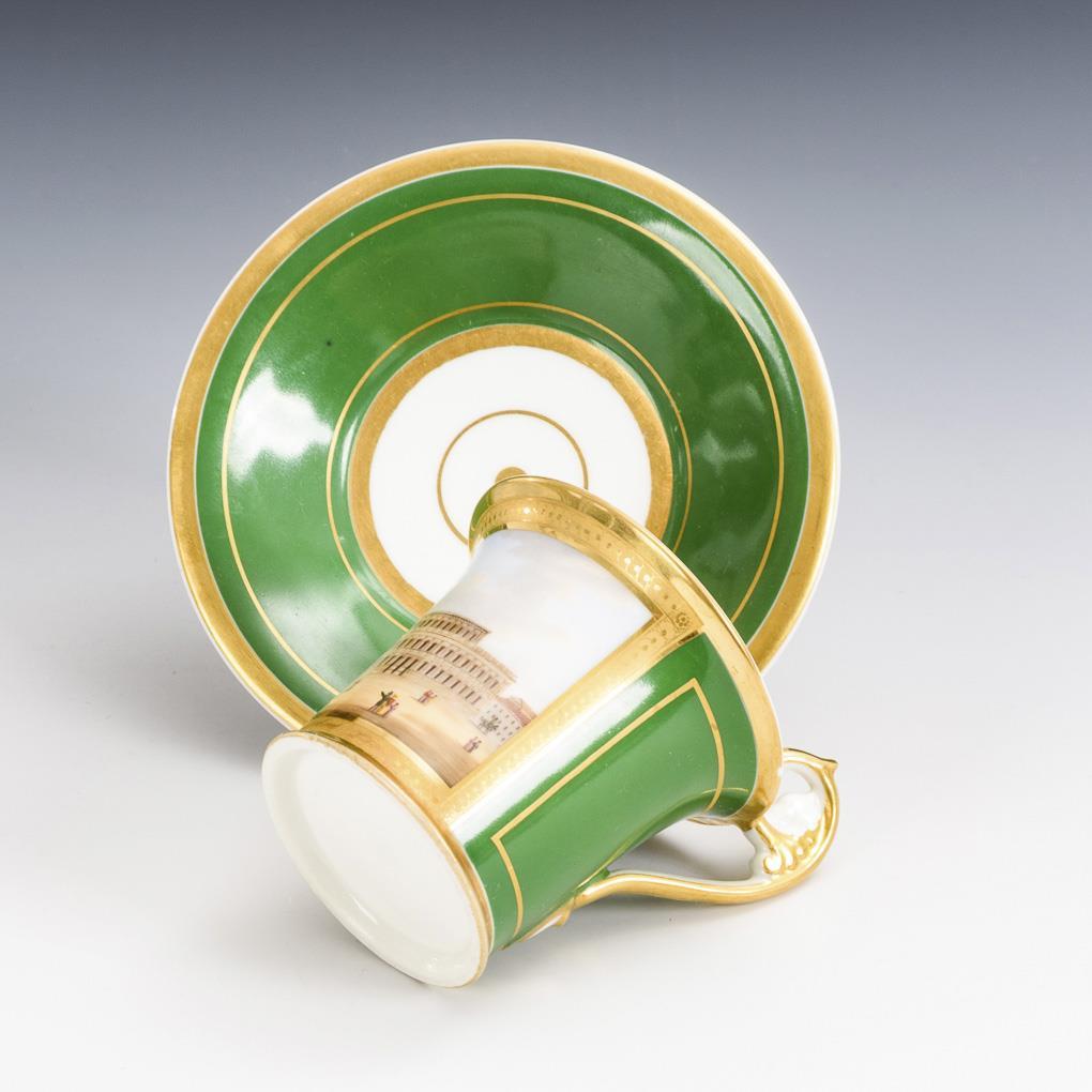 Green ground, polychrome painting, gold staffage. H cup 10 cm, Ø original saucer 14,5 cm.