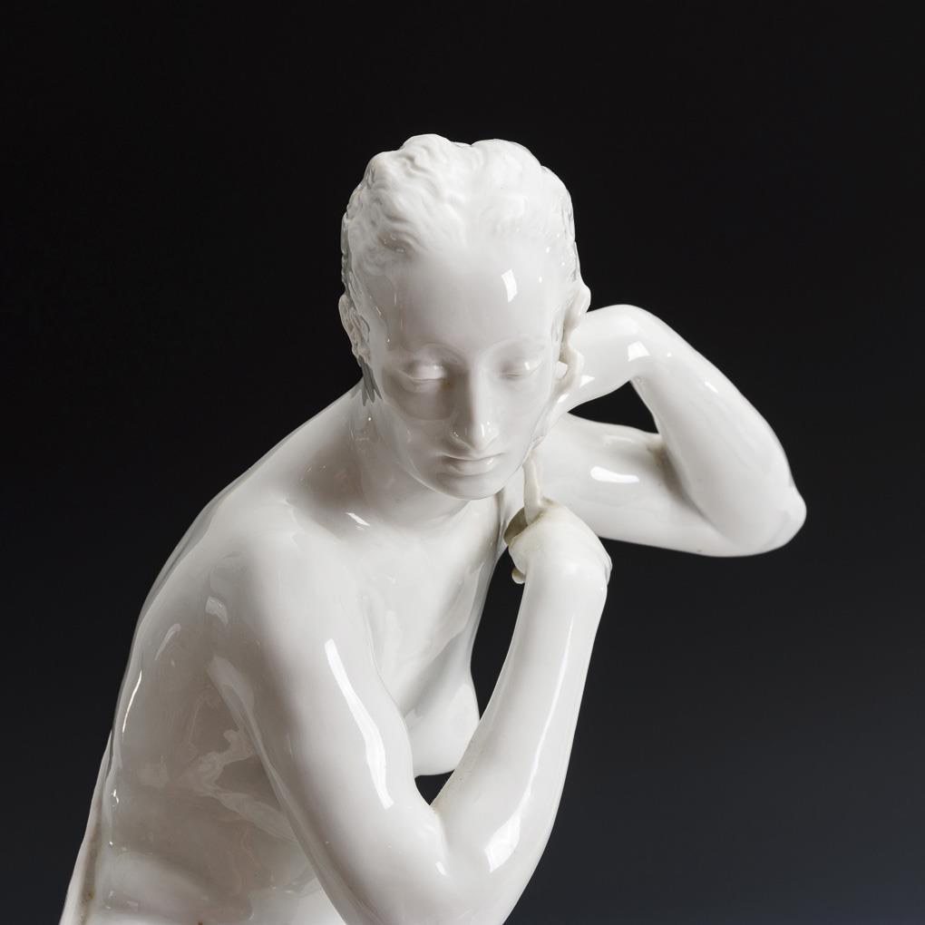 On a natural base beside a quiver with arrows sitting nude of Diana, goddess of the hunt. Left foot glued, burn crack in band, arrow ends bumped and glued.