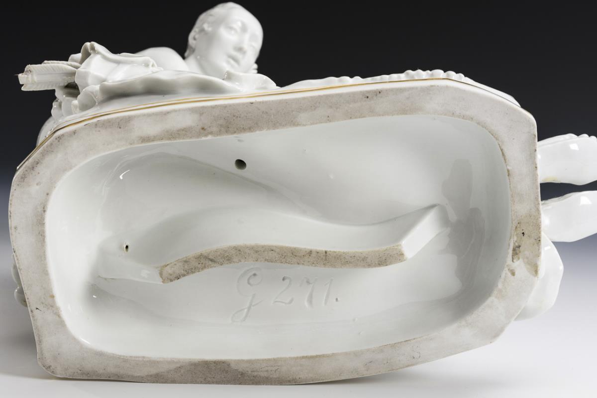 White with gold staffage. H 30.5 cm, L 28 cm.