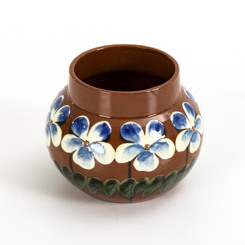 Reddish brown body, floral slip painting in white, green and blue. H 11 cm.