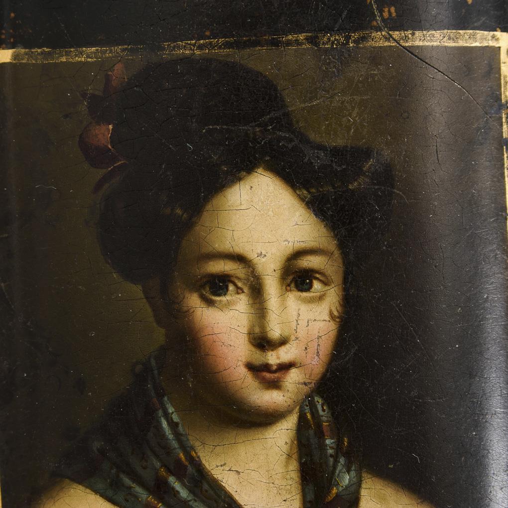 Oblong box with oval cross-section as well as hinged lid. In the front finely painted portrait of a young woman. Bottom reglued, signs of age/use.