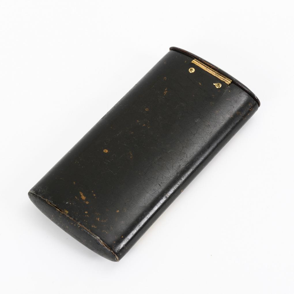 Paper mache painted black with luster insets, painted portrait. 13 x 6.5 x 2.5 cm.