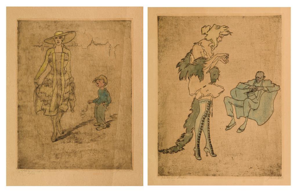 2 Werke: "Die neuen Stiefel" und flanierende Dame mit rauchendem Jungen