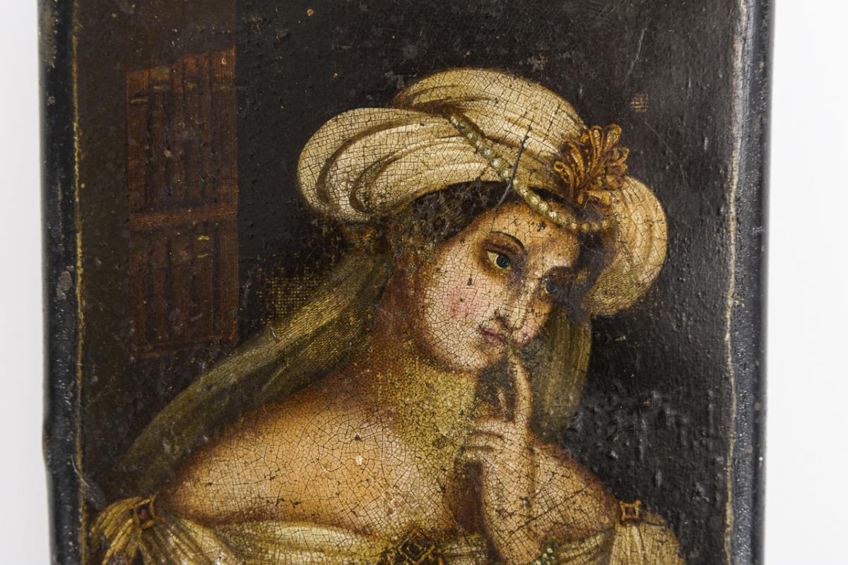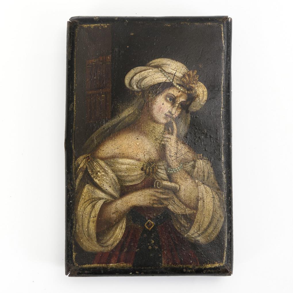 Thoughtful Oriental woman with letter. Hinge detached, heavy signs of age/use.