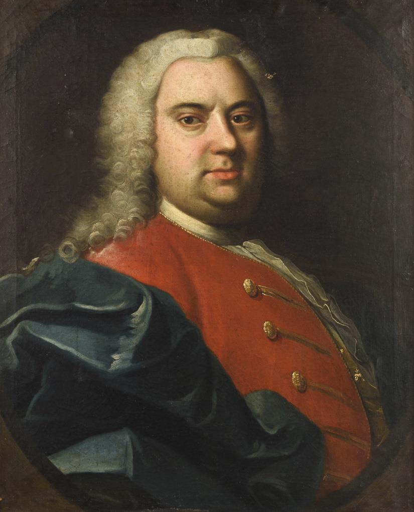 Portrait of a man with grey allonge wig and in red frock coat with blue coat. One restored spot, traces of age.