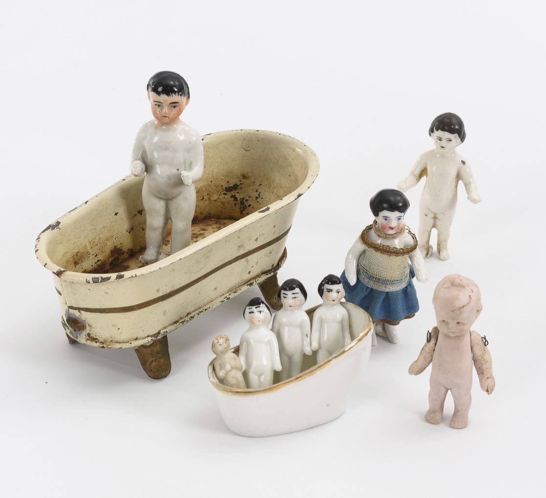 Shower, 3 washstands, 3 sinks with mirrors and 3 baths. In addition, some soap dishes, 1 bisque doll and 7 miniature bath dolls. Partly strong signs of age and defects.