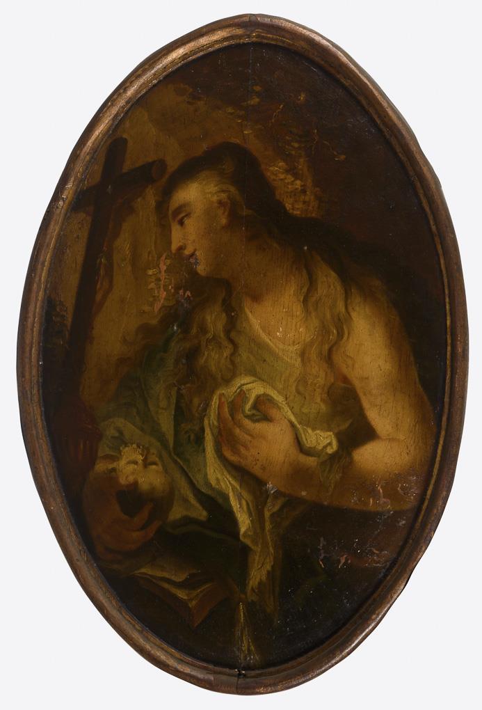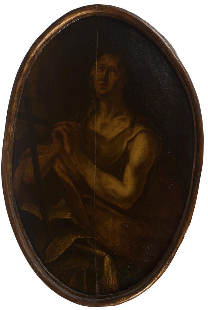 Two oval depictions of the saints with hands folded in prayer before the cross or devoutly looking towards the cross with the skull in hand. Some signs of age, partly in need of restoration.