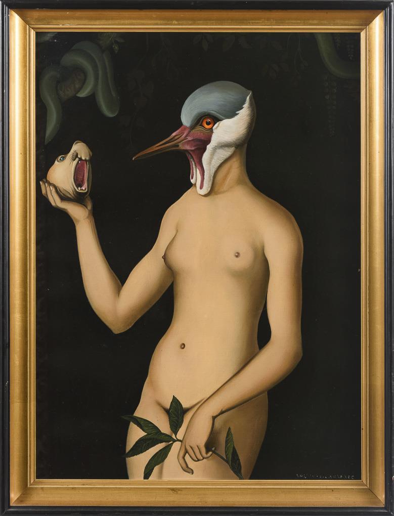 In old-masterly manner painted Eve with bird head and seal head in hand vqr dark background under a tree with visible snake.
