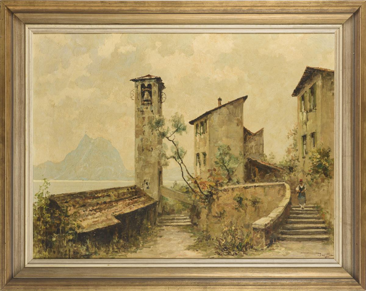 Staffage figure on the stairs of the house with view over the lake in the sunshine. Minimal traces of age.