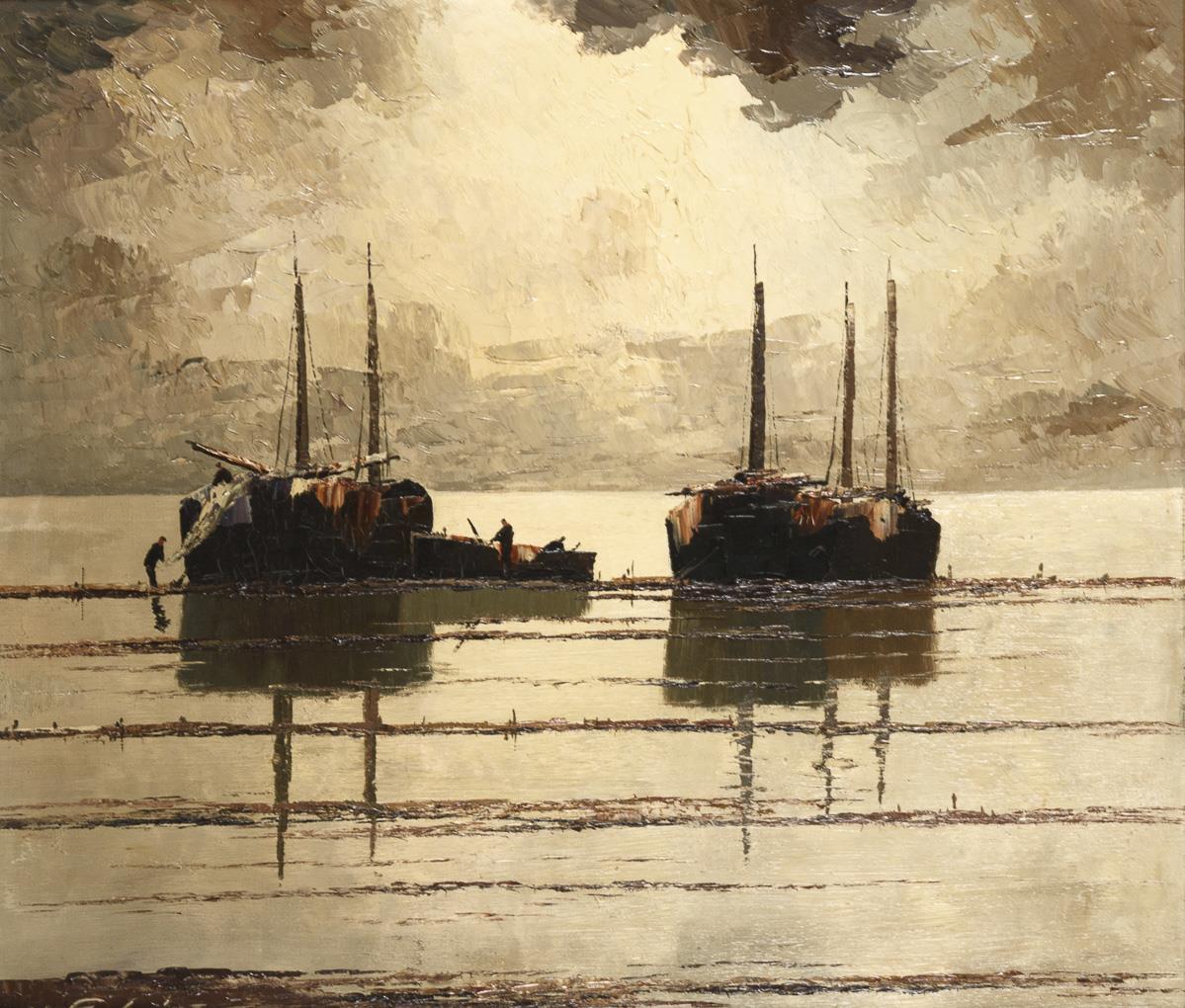 Fishing Boats in the Lagoon in Pale Light under Cloudy Sky. Traces of Age.