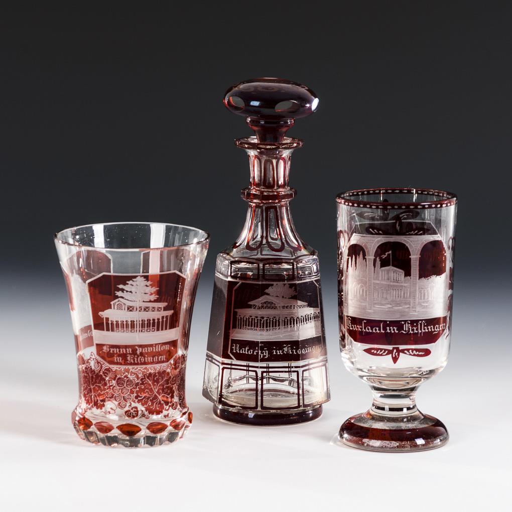Carafe, foot cup and crater cup. All with engraved inscribed views of Bad Kissingen. Partially rubbed.