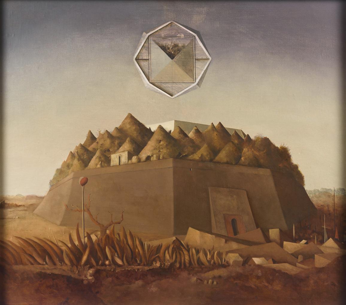 Surrealistic landscape with mountainous scenery behind high walls in wide wasteland with ruins.
