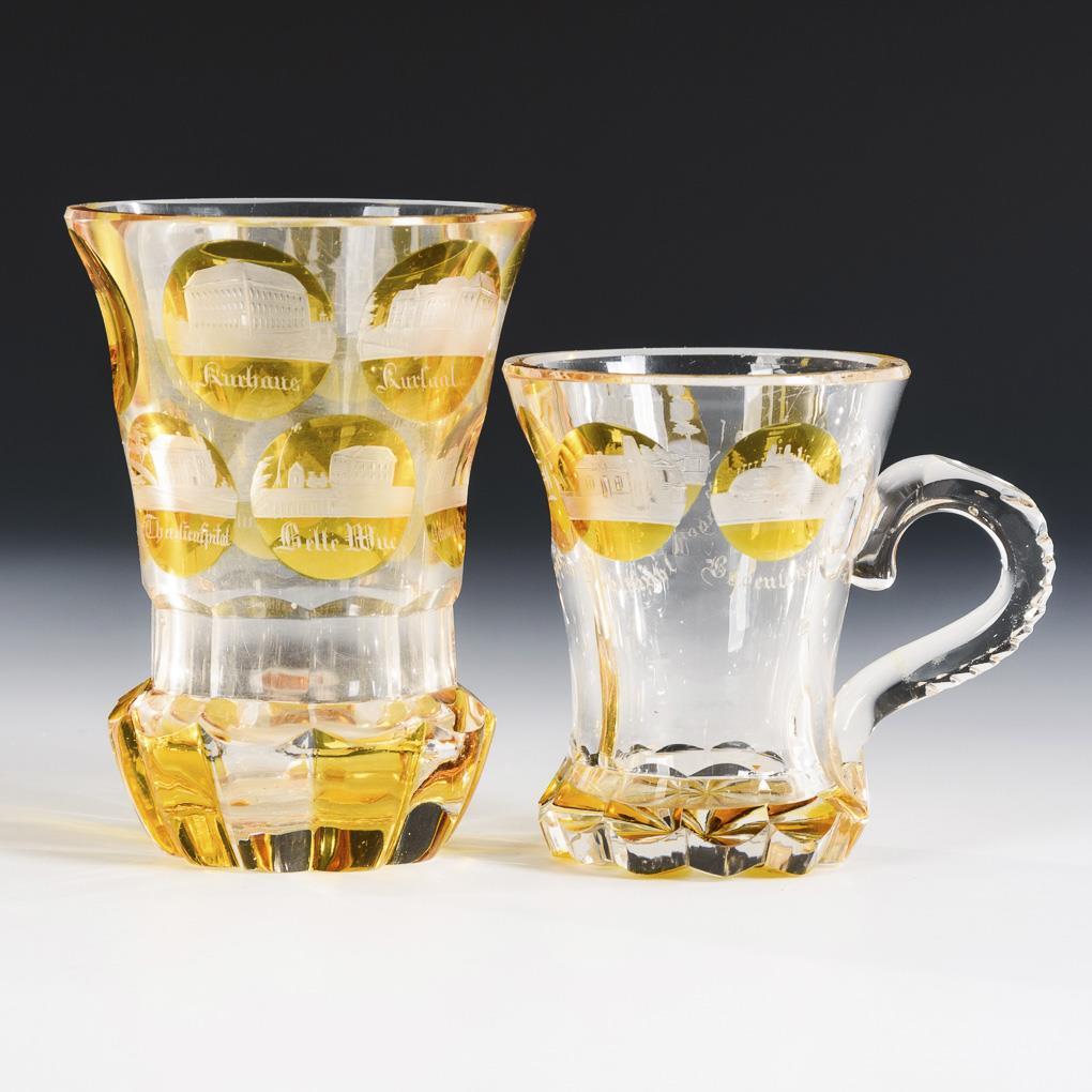 1 handled mug and 2 cratered mugs. All with engraved, inscribed views of Bad Kissingen. Mouth rim of the handle mug bumped.