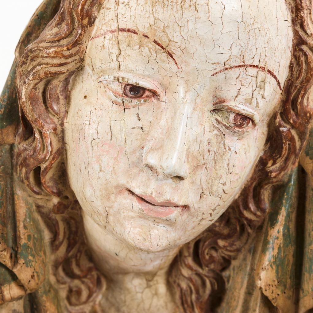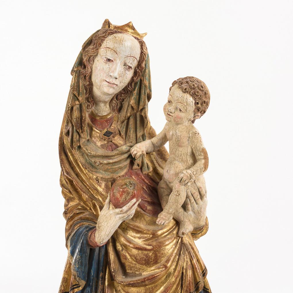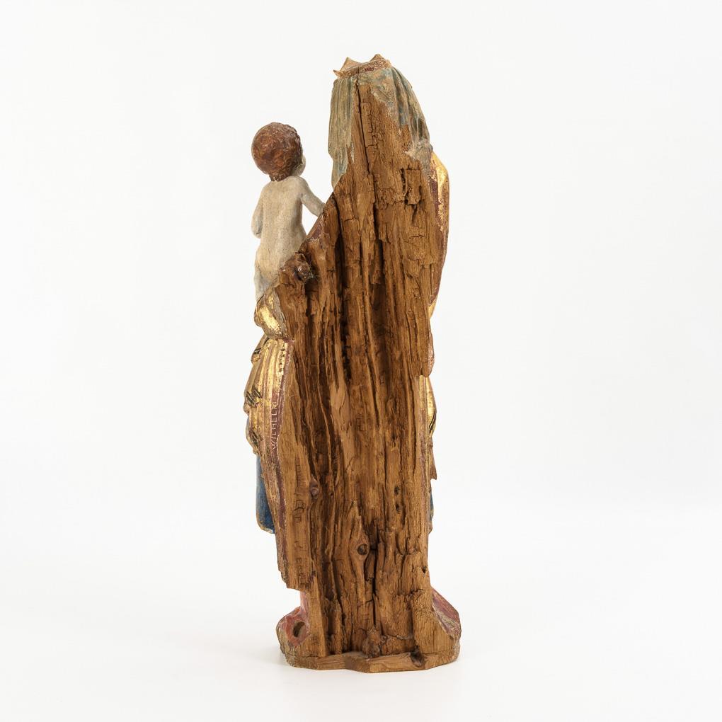 In imitation of the Riemenschneider Madonna carved "gothic" Mother of God with the naked infant Jesus. Dry cracks, hollowed on the reverse due to weathering, signs of age/use.