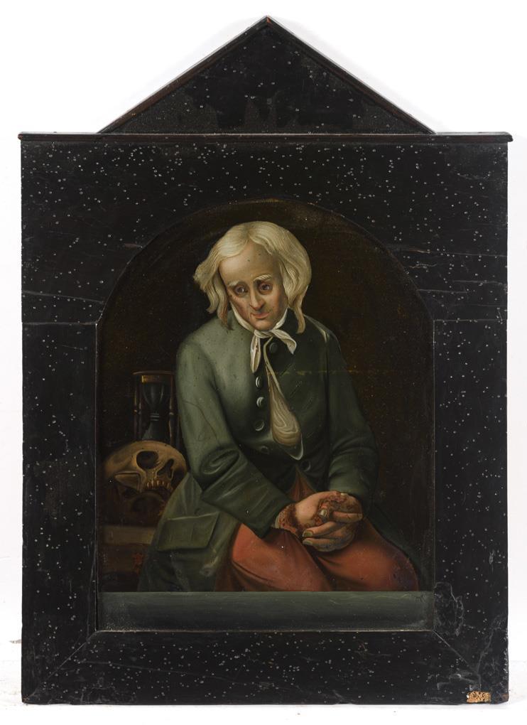 Older man in green frock coat with skull and hourglass. Traces of age, restored.