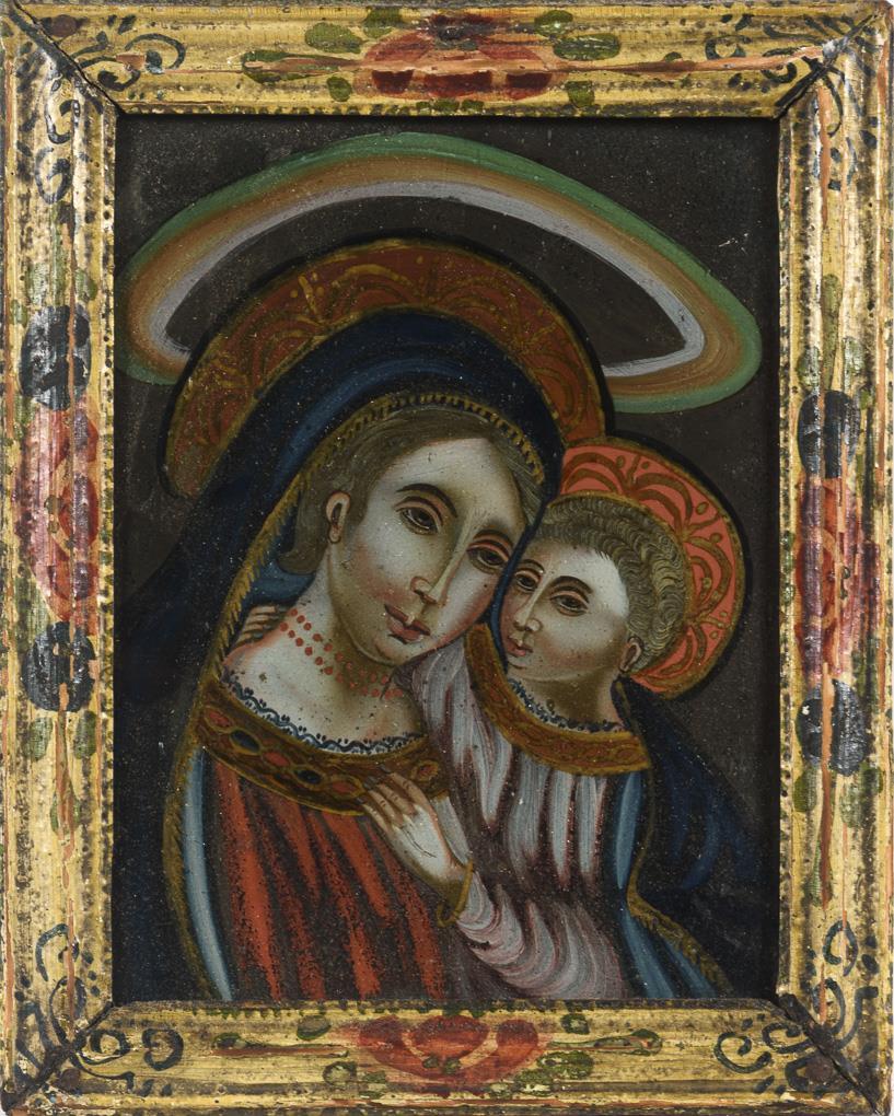 Iconic and naively painted depiction of Mary with the infant Jesus. Light traces of age.
