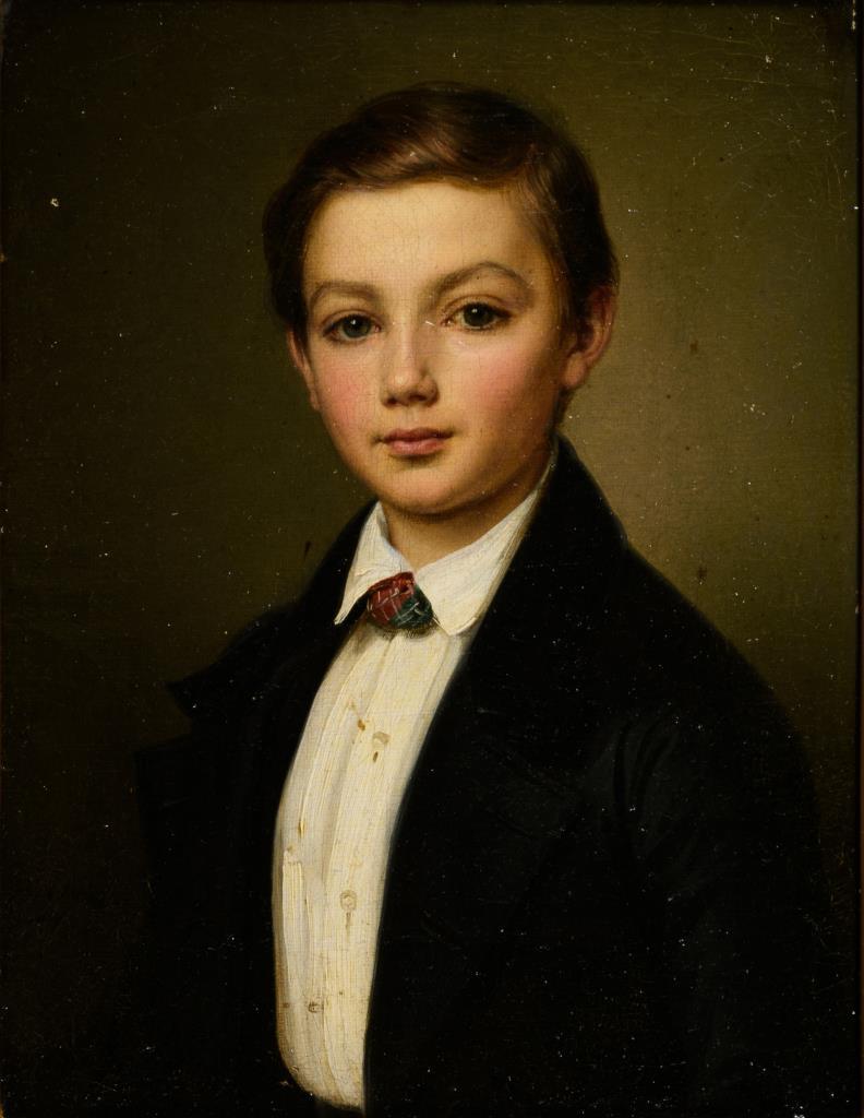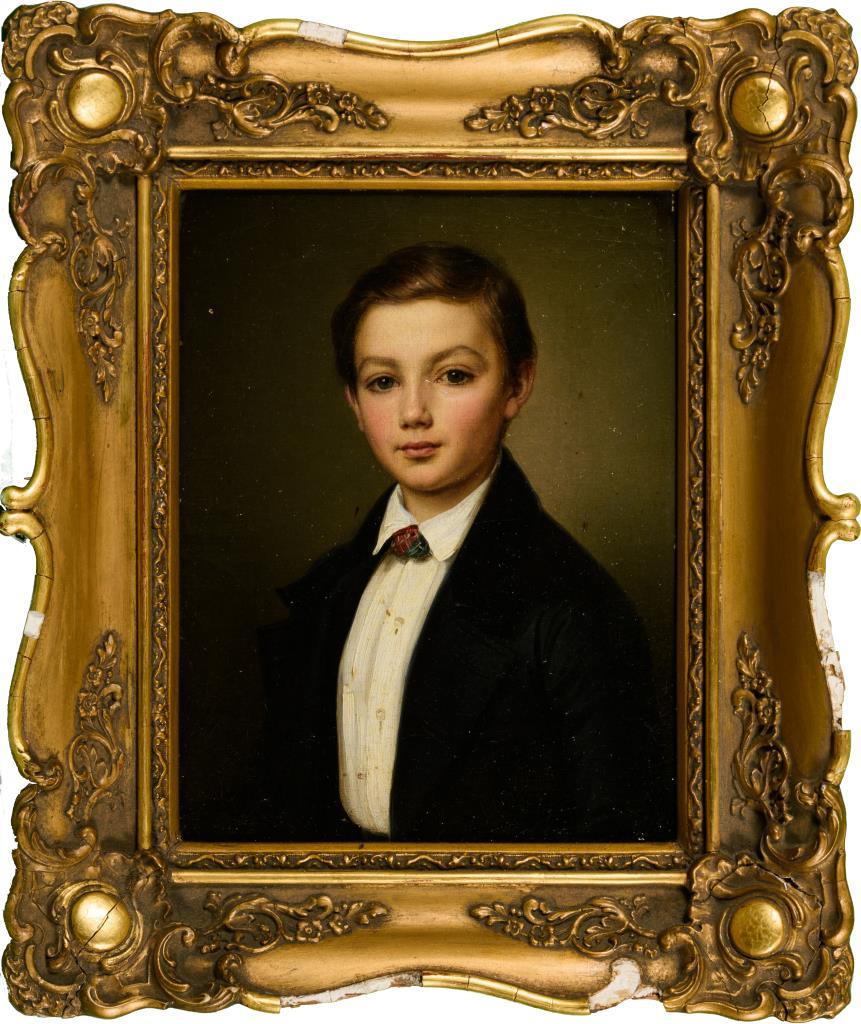 Porträt eines Jungen im schwarzen Anzug mit weißem Hemd. Leichte Altersspuren.