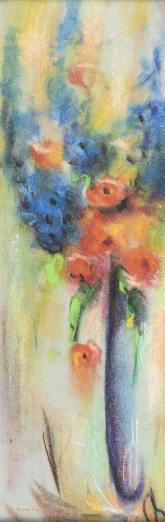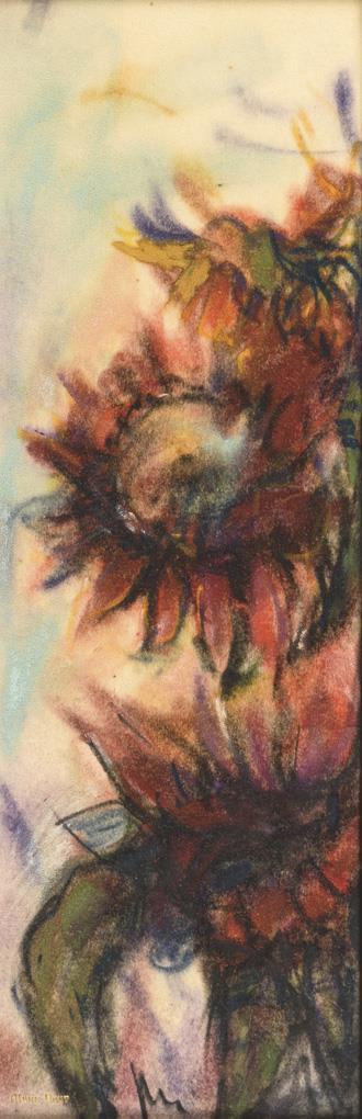 Expressive depictions of sunflowers and a bouquet in slender vase.
