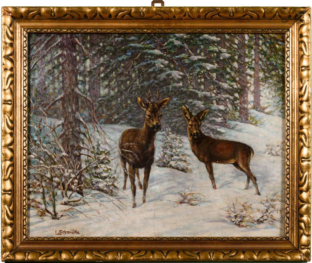 Öl/Sperrholz.Links unten signiert, verso Vorzeichnung zu weiterem Gemälde mit Rotwild.1. Hälfte 20. Jh.