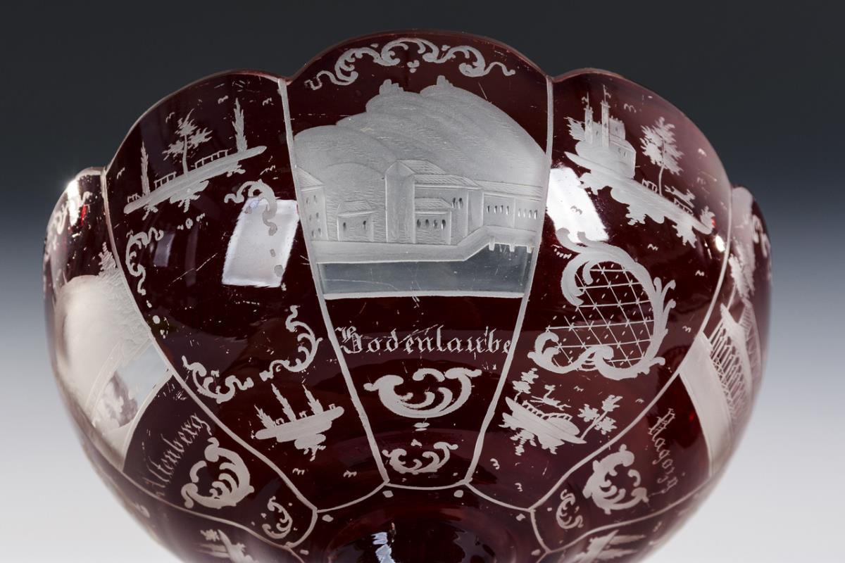 Cylindrical bowl and footed bowl with ten-pointed dome. All with engraved, inscribed views of Bad Kissingen. Scratch marks, 1 bump each on the mouth rim of bowl and foot bowl.