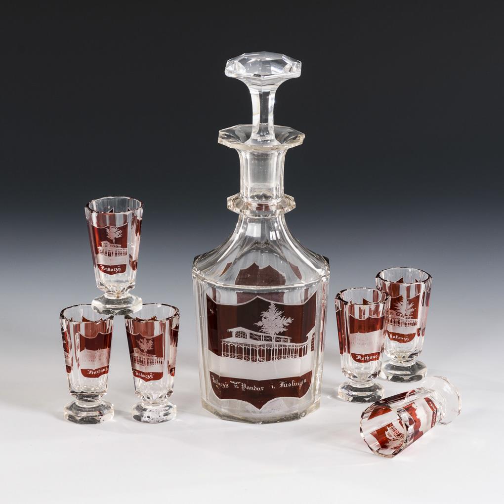 Ten faceted carafe with stopper, 6 small footed tumblers. On the front an engraved, inscribed view of Bad Kissingen. Bump on the mouth rim of the decanter, minor rim bumps, 1 shot glass with stress crack on the rim.
