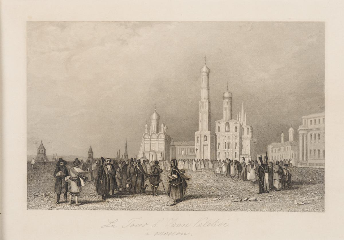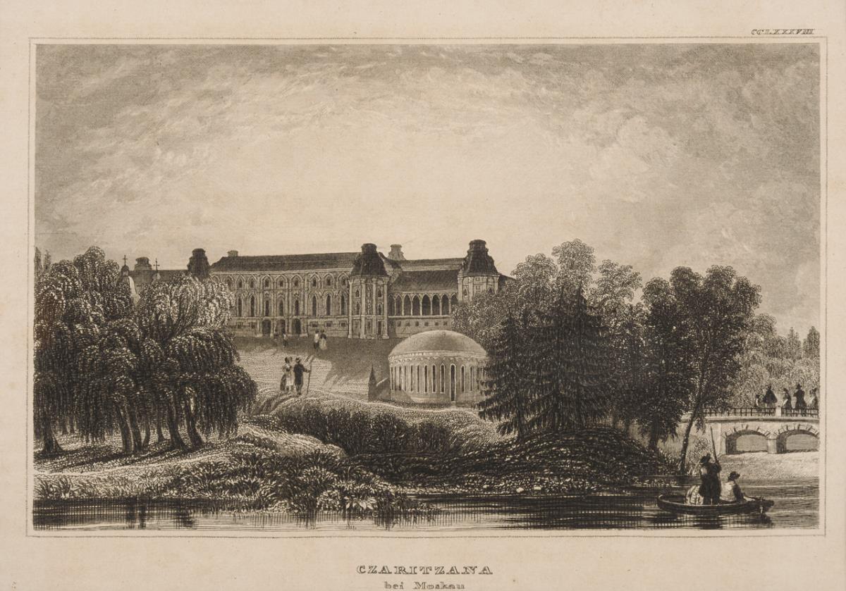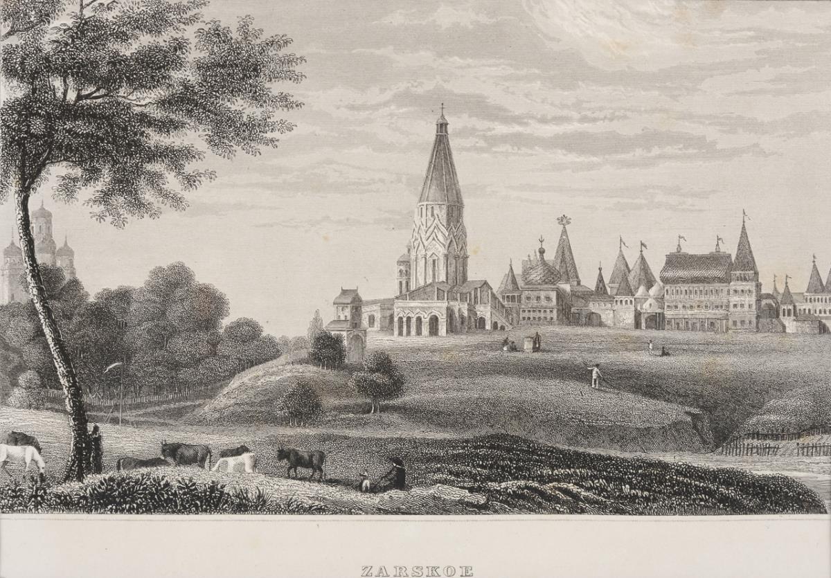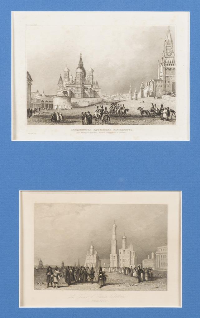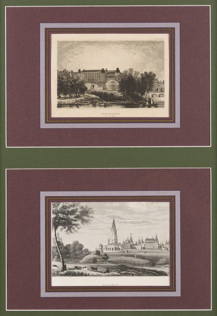 View of the Castle "Czaritzana" and of "Tsarskoe", framed & behind glass: 63 x 48 cm | View of the Church "Vasily Blaggennoi in Moscow" and the Monastery "Ivan Velekoi", framed & behind glass: 60.5 x 51.5 cm. Somewhat foxing.