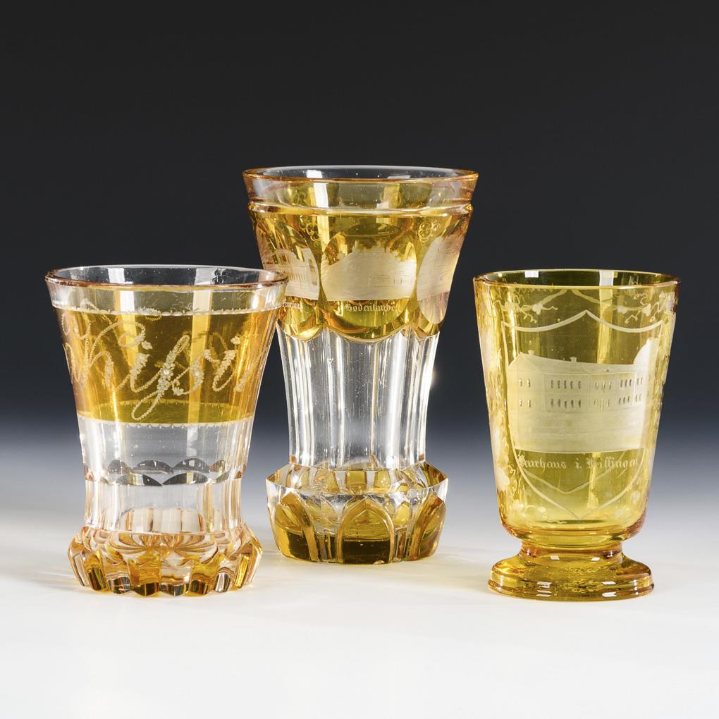 2 crater cups and 1 foot cup. 2x with engraved inscribed views of Bad Kissingen, 1x with the inscription "Bad Kissingen". formed from engraved floral tendrils, 1x rubbed gold decoration, 1x bump on the foot rim.