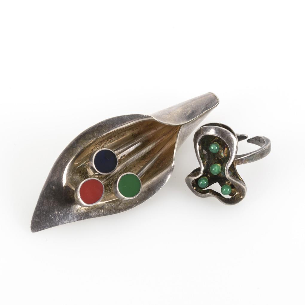Sculptural, stylized flower brooch with 3 enameled "flower stamps". Ball hook. Ring with 4 small green agate balls. Open rail.