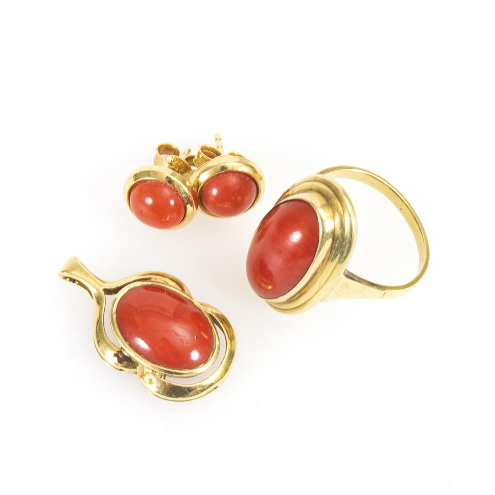 Pendant, ring and pair of ear studs with casket-set coral cabochons. Rigid eyelet, narrow rail and pin mechanism.